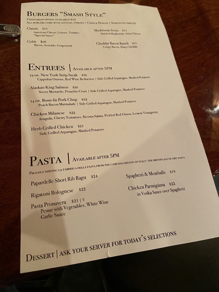oz. prime pork chop served with choices of peach & bacon marmalade, grilled asparagus, or mashed potatoes. Options to substitute sides: fries, broccoli, or sautéed spinach. Meat temp varies.