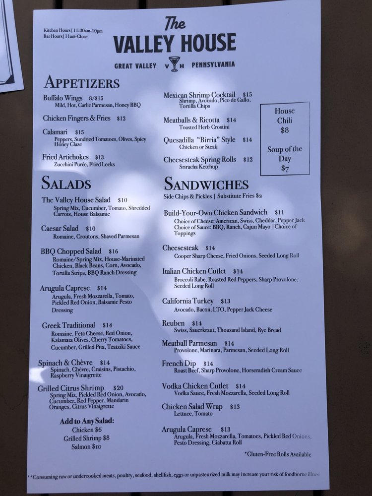 Located in Malvern, PA, The Valley House Bar & Restaurant offers a unique dining experience with its New American cuisine and classic bar atmosphere. This establishment is known for its efficient and friendly service, top-notch food offerings, and warm, inviting interior. Customers praise the varied menu options and reasonable prices, making it a go-to spot for a delicious meal with friends or family. The historic ambiance of the restaurant adds to the overall dining experience, providing a cozy and nostalgic feel. Whether you're looking for a casual dining experience or a place to unwind with a drink at the full bar, The Valley House Bar & Restaurant offers something for everyone. With happy hour specials, outdoor seating, and attentive waitstaff, this restaurant stands out as a must-visit destination in Malvern.